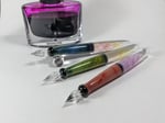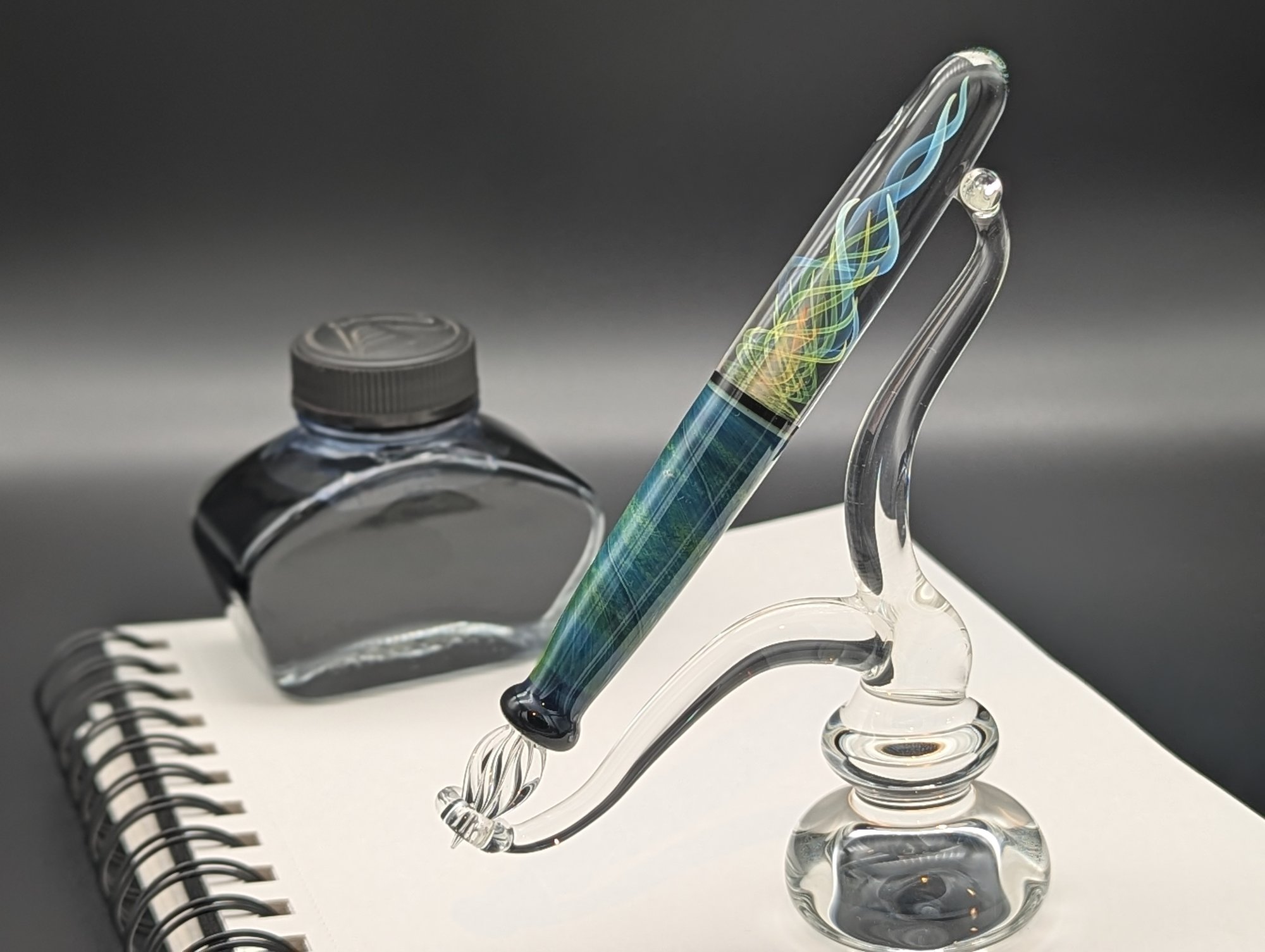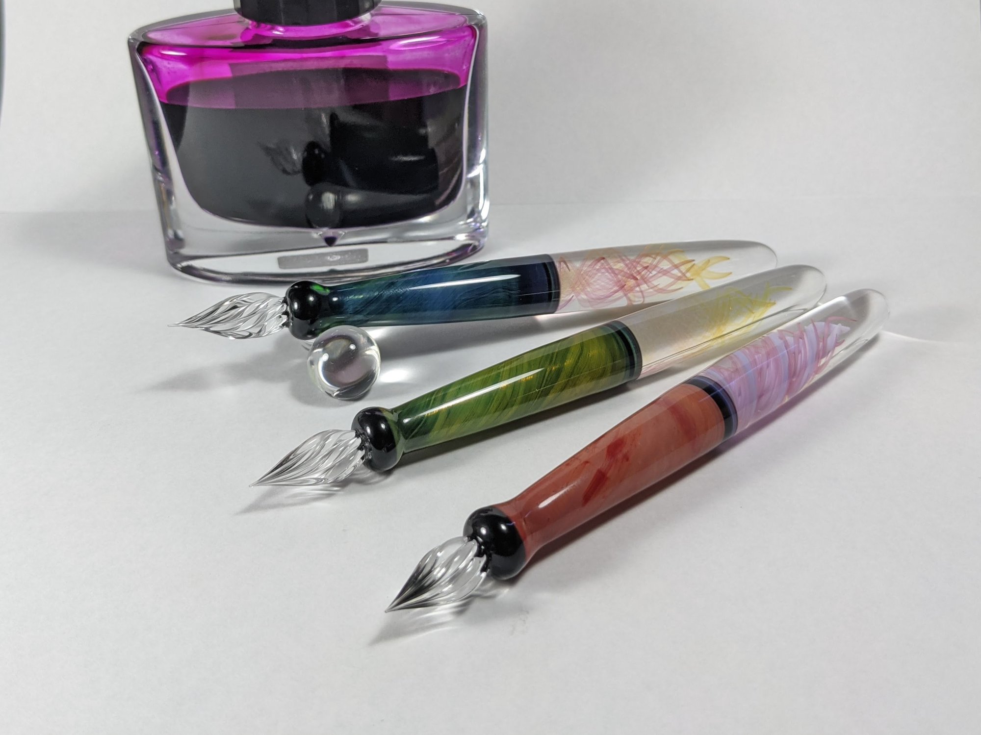These are handmade glass dip pens in a series so the color, pattern, and size will vary a bit. I try to keep the colors as close to the picture as possible. The glass nibs have eight channels for the ink to fill, so you are able to write for quite a long time before needing to dip it again.