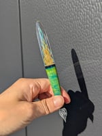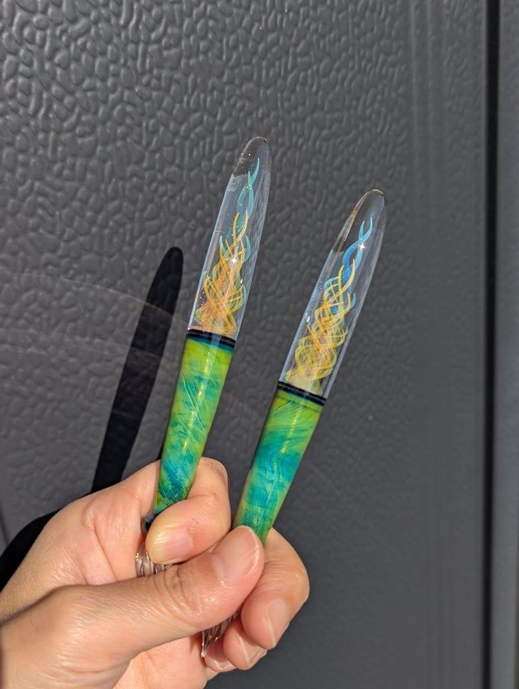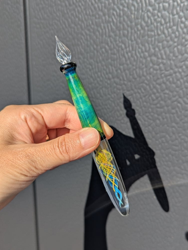 Here is some information about the pen. It is made with borosilicate glass and fumed with 24kt gold and 99.99 fine silver. Since the color on the pen is translucent, the color will change depending on the background.
