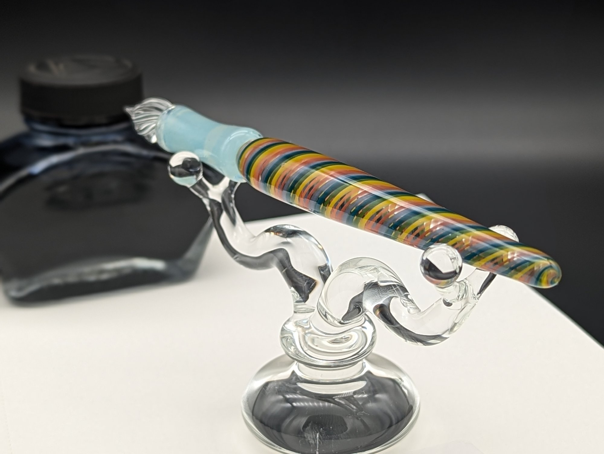 These are handmade glass dip pens in a series so the color, pattern, and size will vary a bit. I try to keep the colors as close to the picture as possible. The glass nibs have eight channels (there are more or less channels in the italic nibs depending on the size) for the ink to fill, so you are able to write for quite a long time before needing to dip it again.