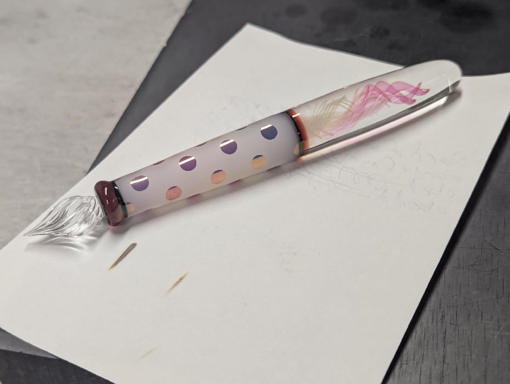 Here is some information about the pen. It is made with borosilicate glass and fumed with 24kt gold and 99.99 fine silver. Since the color on the pen is translucent, the color will change depending on the background.