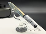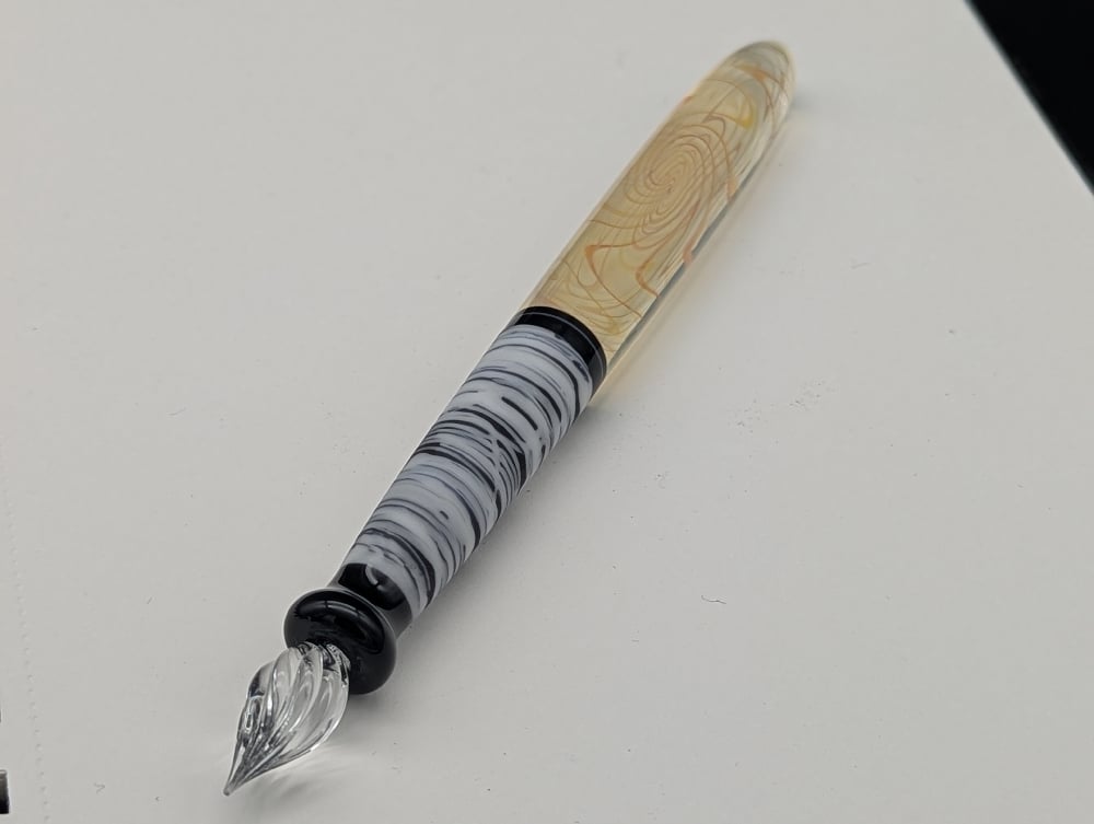 This is handmade glass dip pen. It is the first of what will be a series in a series with the back fume pattern. The glass nib has eight channels for the ink to fill, so you are able to write for quite a long time before needing to dip it again.
