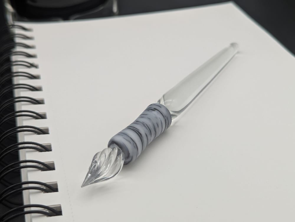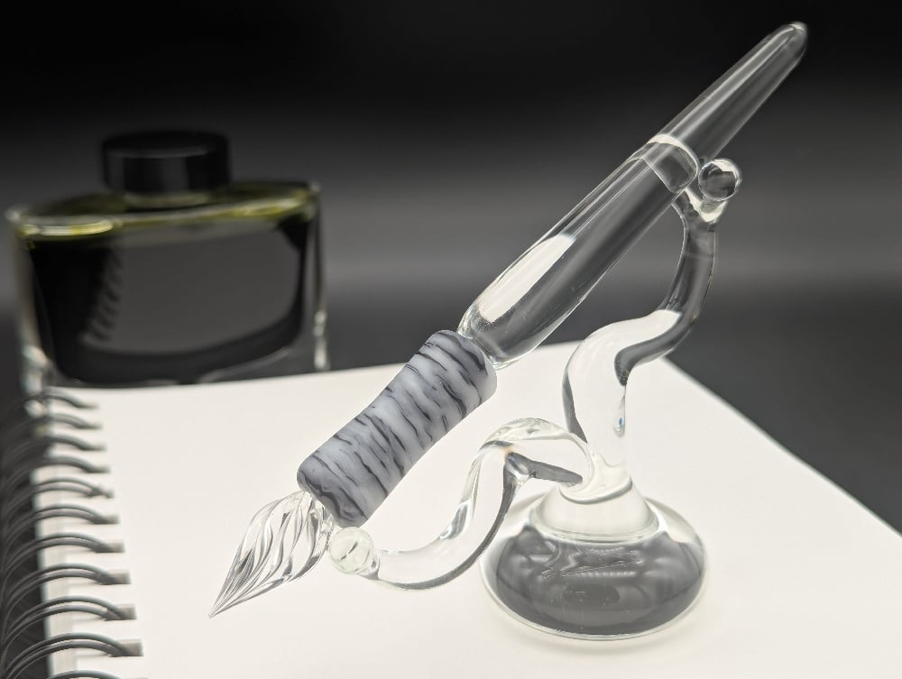 These are handmade glass dip pens in a series so the color, pattern, and size will vary a bit. I try to keep the colors as close to the picture as possible. The glass nibs have eight channels for the ink to fill, so you are able to write for quite a long time before needing to dip it again.
